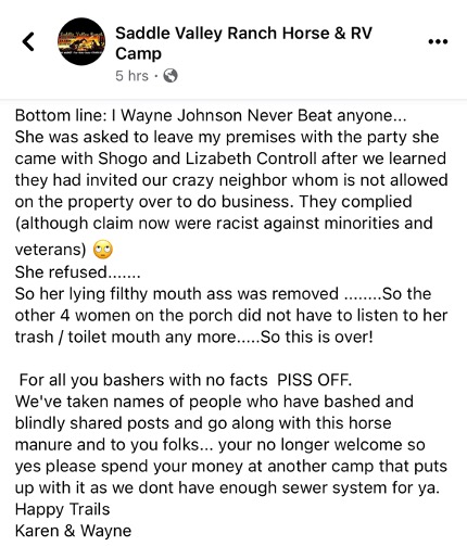 Saddle Valley posted the following after the local prosecuting attorney did not pursue charges for assaulting the female camper. The post has since been removed, probably a good idea because it really shows his true colors.